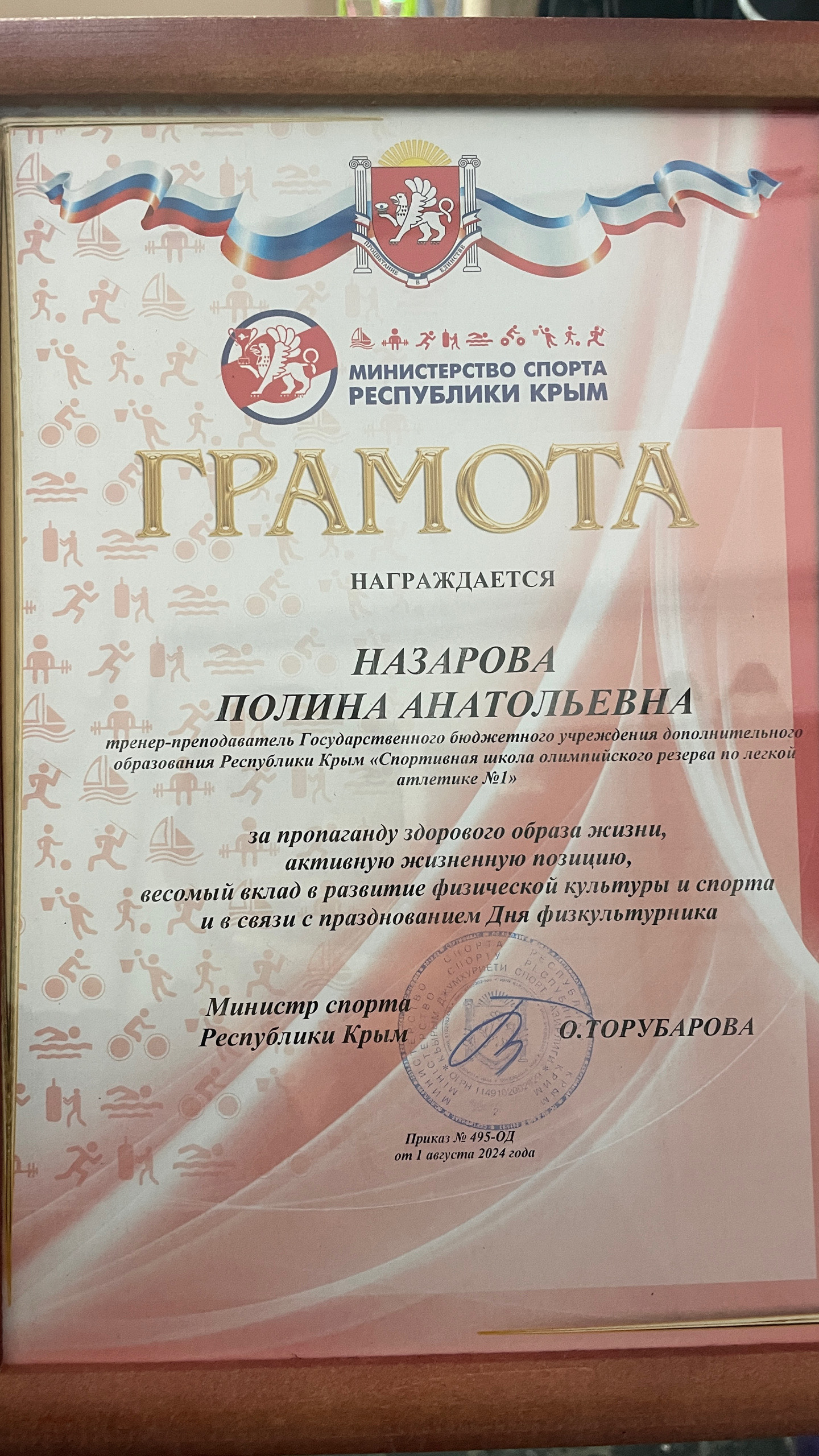 Преподавателя дополнительного образования секции «Легкая атлетика», Назарову Полину Анатольевну, с получением грамоты от Министерства спорта Республики Крым:
