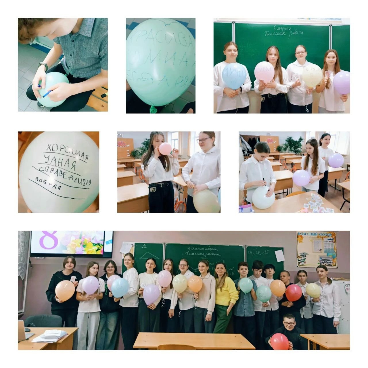 Творческий и оригинальный подход продемонстрировали учащиеся 7-А класса. Ребята решили поздравить мам необычным способом: они надули яркие шары, на каждом из которых написали прилагательные, описывающие самых дорогих людей. Получилось настоящее «облако комплиментов»! Кроме того, каждый ученик подписал открытку с теплыми пожеланиями, вложив в неё частичку своей души.